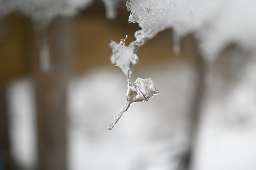 A shard of solid water hangs on by the smallest thread, waiting for the gentlest of breezes to whisk it away.