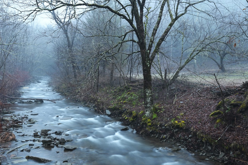 A warm front has rolled in, releasing winter’s early snowfall into the nearby waterways and filling the morning atmosphere with a thin and widespread mist. The augmented motion of the creek presents a paradoxical stillness to the area.